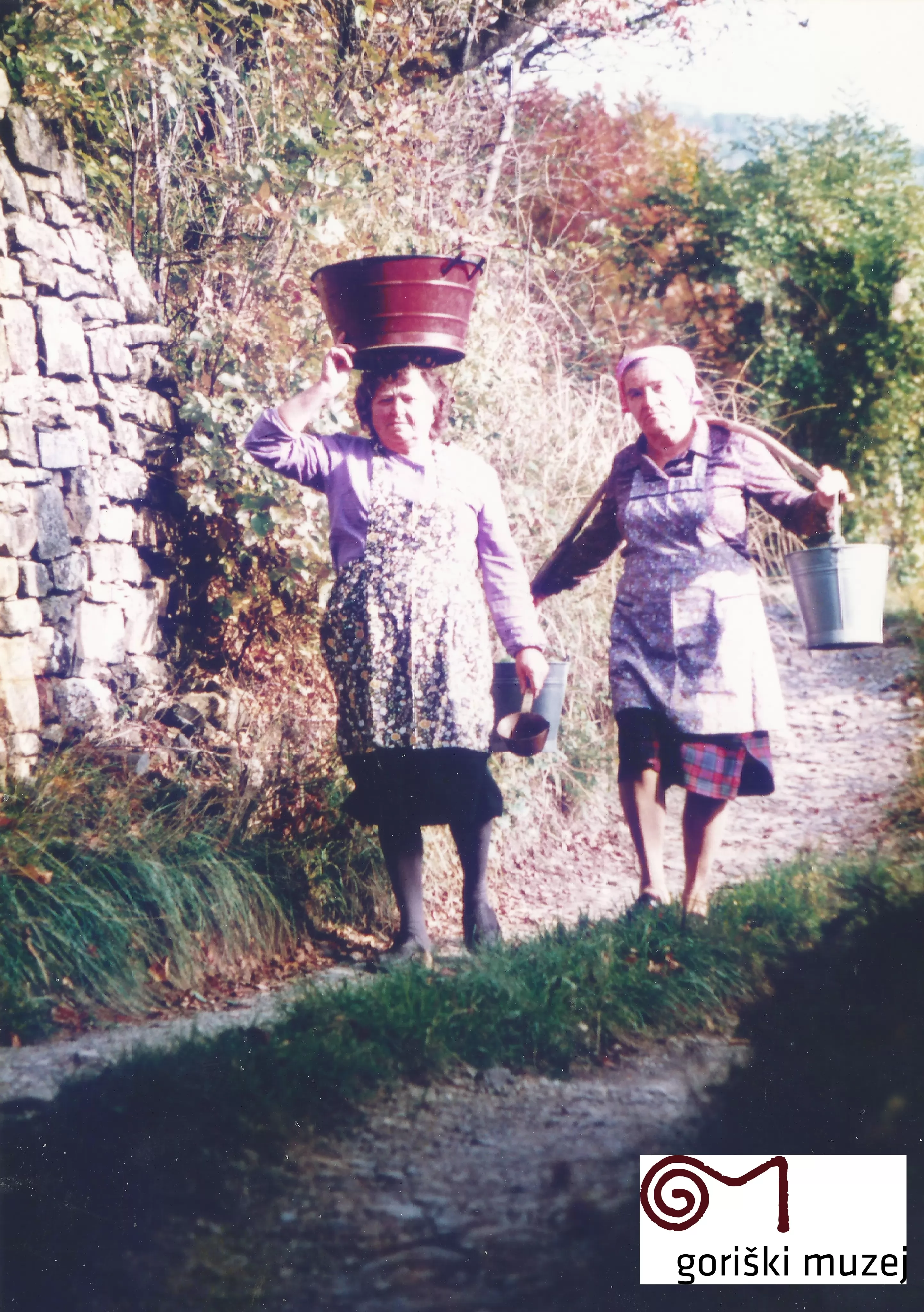 Back in the day, bringing water from distant wells to the houses was a daily chore for women. From the hamlet of Breg (the present-day village of Krasno) in the Goriška brda area, women would bring water from a well that was just under a kilometre from the village. They fetched water whenever needed, two to three times a day. A woman could carry two small buckets using a wooden shoulder pole or a larger bucket on her head on top of a ring-shaped pad. The village got a water pipeline in 1953, this arduous chore, however, was still fresh in people’s memory.