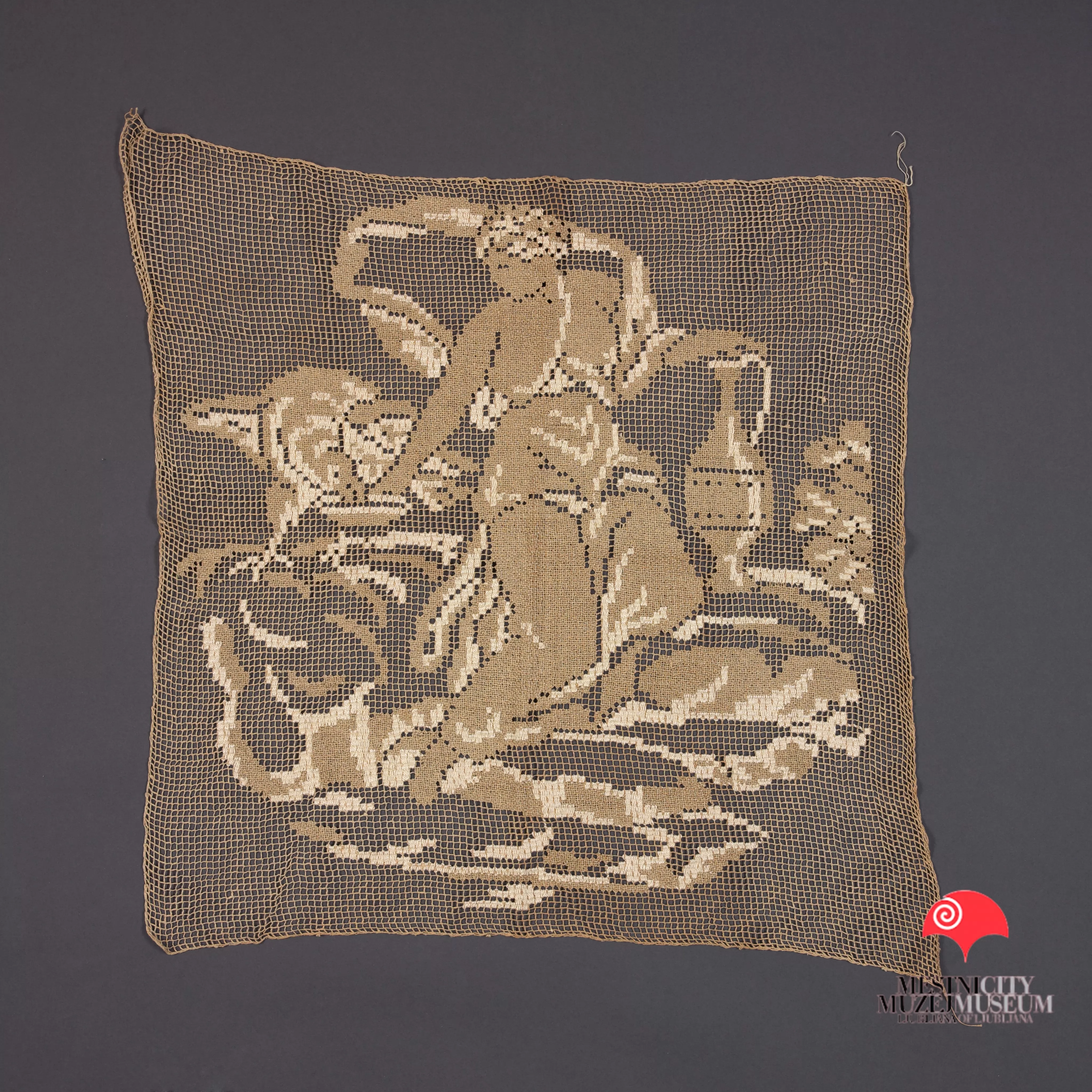 Filet lace, 1st half of the 20th century, unknown creator, probably made for a cushion, depicted subject: a female figure with a jug. Photo of the lace: Andrej Peunik.