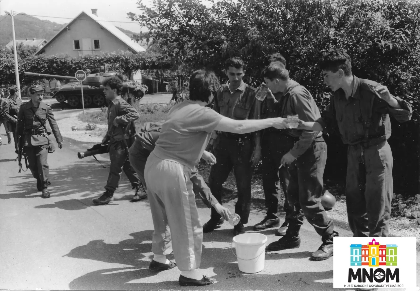 A local woman is offering water to the soldiers after the surrender. The photo was taken on 28 June 1991 following the surrender of a Yugoslav People’s Army column of tanks in Limbuš. Photo: Danilo Škofič, Večer newspaper.