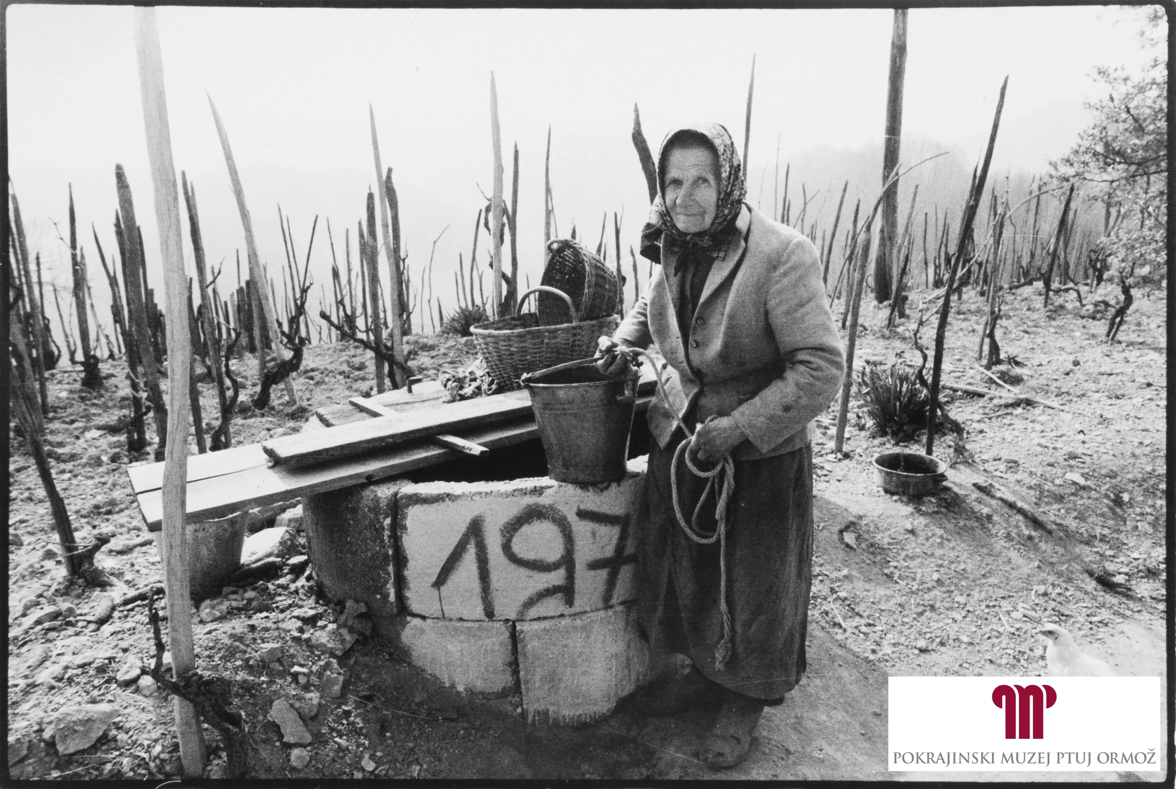In Haloze, carrying water was one of the most important, but also one of the most difficult chores, as the water springs were usually in deep ravines, so water had to be carried up the steep slopes to the homestead at the top of the ridge either in a hand-held earthenware jug or in wooden shoulder baskets. Near some farmhouses there were deep wells dug in the ground or rainwater was collected in concrete cisterns, which made it much easier for people to get water, 1974.