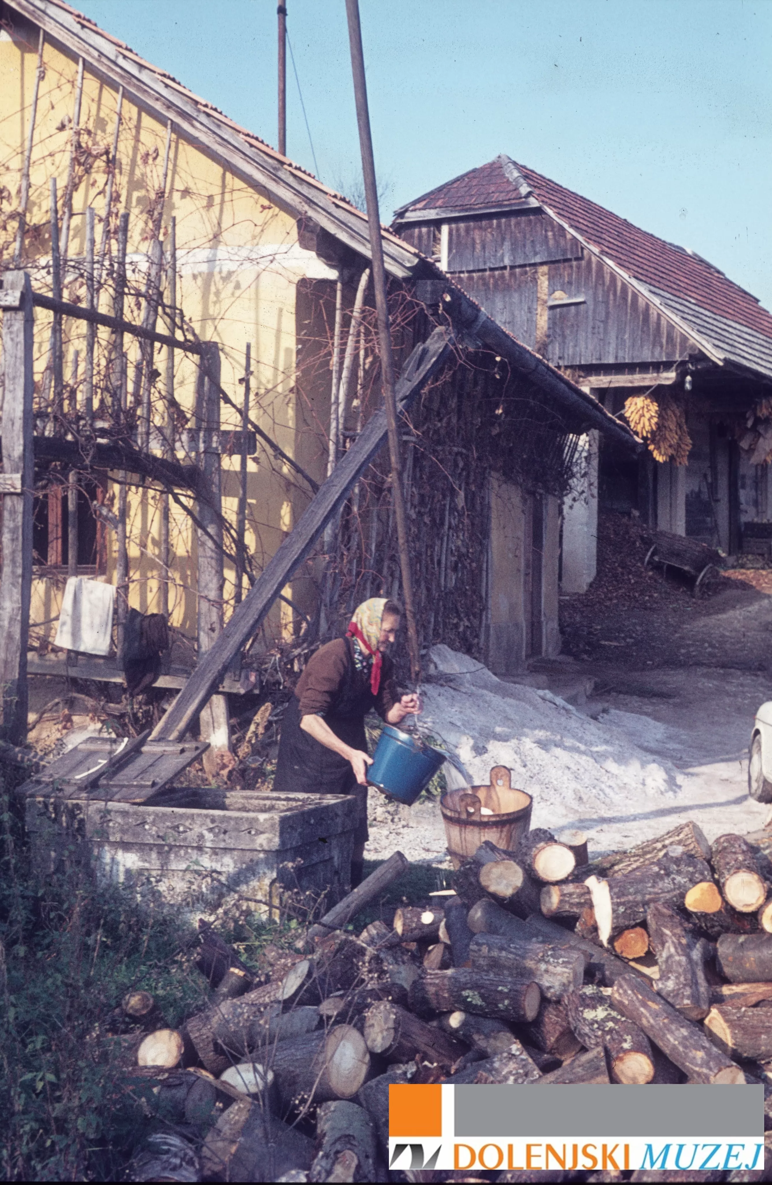 A woman is drawing water from a sweep well, Velike Dole, 1972. Photo: Janez Bogataj.