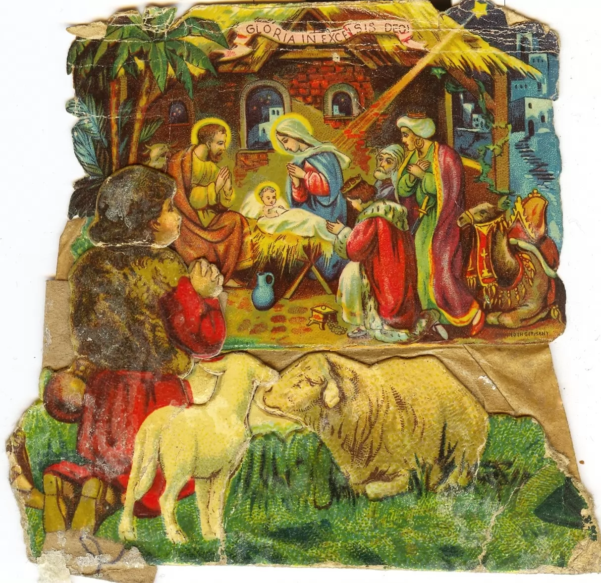 Papirnate jaslice z napisom »Gloria in Excelsis Deo!« s prizorom svete družine in svetih treh kraljev ob Jezusovem rojstvu. Dar: Fanika Lorber, Velike Malence, junij 1987. Inv. št. E2490. Hrani Posavski muzej Brežice.
