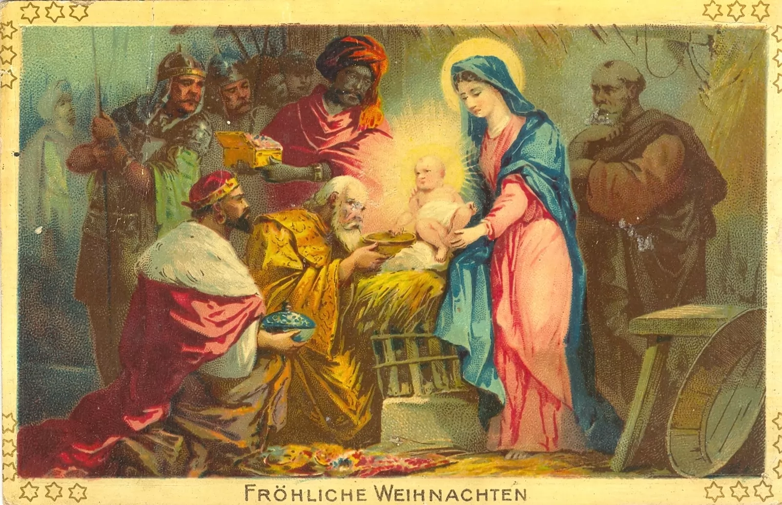 Božična voščilnica, razglednica, z motivom jaslic. Marija z novorojencem, trije kralji z darovi; z datumom: 19. 12. 1906. Iz zapuščine Terezije Cvetanovič, Brežice. Inv. št. E5030. Hrani Posavski muzej Brežice.