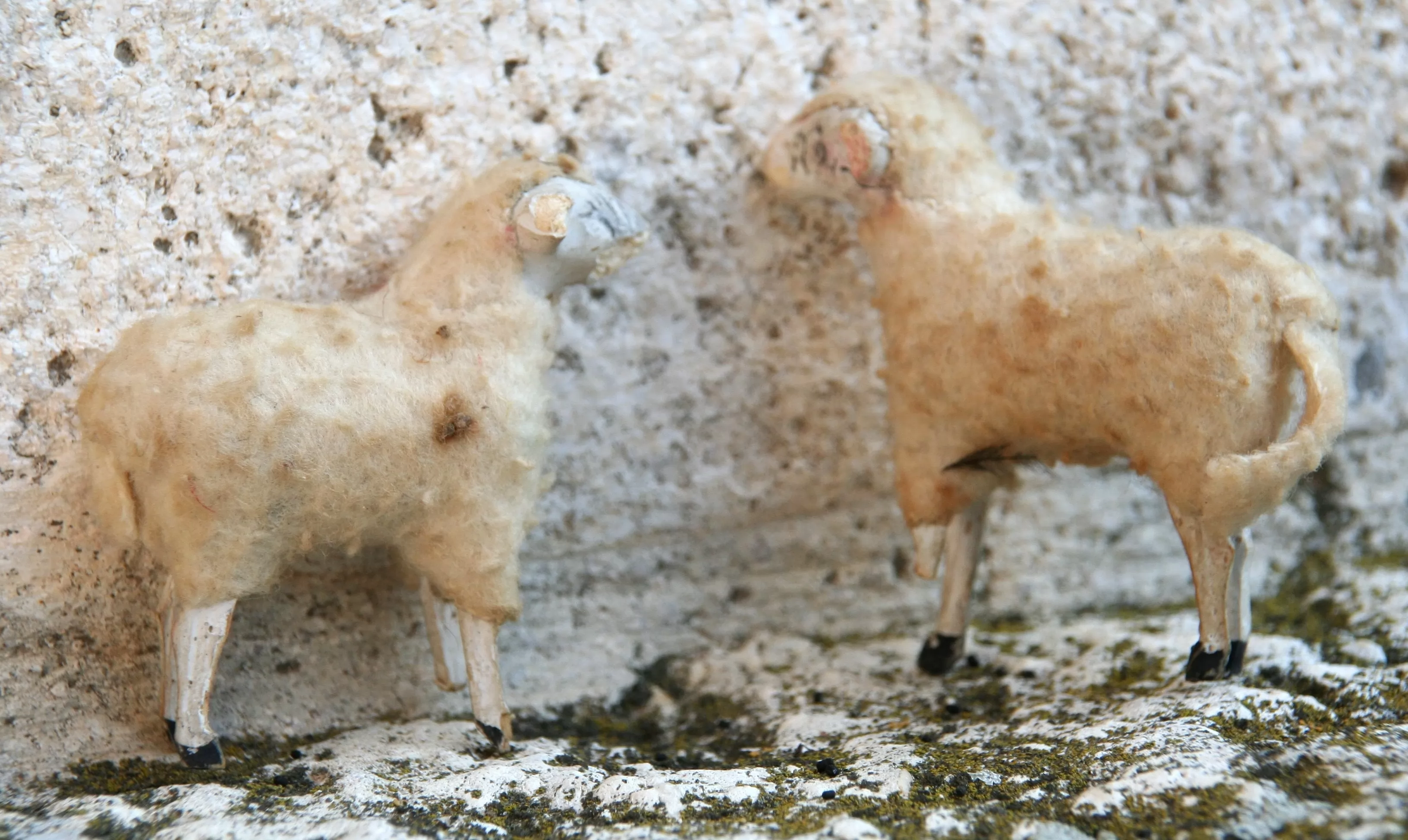 Jaslična figura – dve ovčki, tekstil, les. Iz zapuščine Terezije Cvetanovič, Brežice. Inv. št. E5074. Hrani Posavski muzej Brežice.