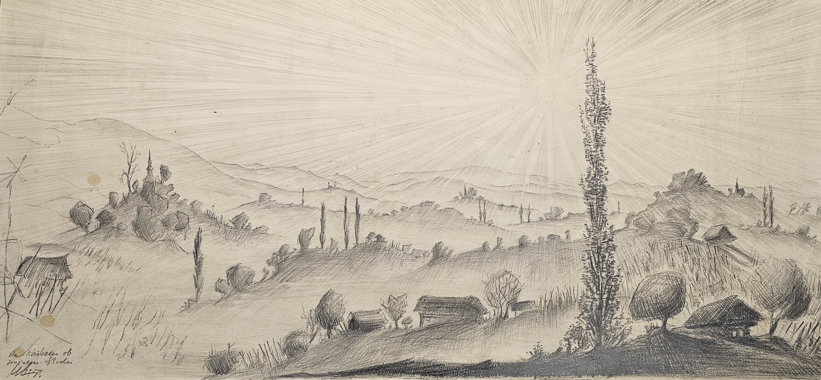 Slika 1: Miroslav Kugler, Na Pišečkem ob sončnem zahodu, 1959, svinčnik na papirju, 38.7 cm x 84.2 cm, inv. št. KZ1-957.