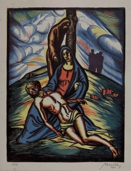 - Pieta, 1926, Franjo Stiplovšek (1898–1963), barvni lesorez, papir. Hrani Posavski muzej Brežice, inv. št. KZ 1/ 274. Foto: Nives Slemenšek.