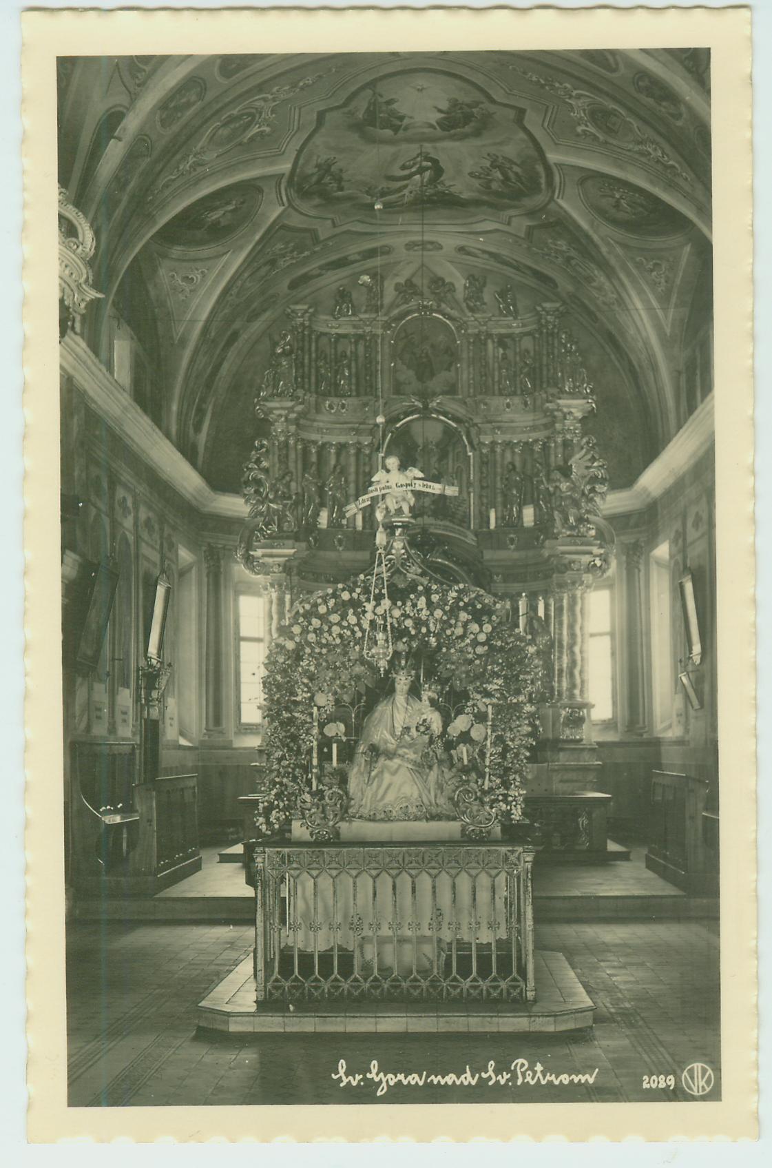 Razglednica Sv. Gora nad sv. Petrom, okoli 1935, motiv: notranjost cerkve z oltarjem, neodposlana. Inv. št.: Z4:3810.