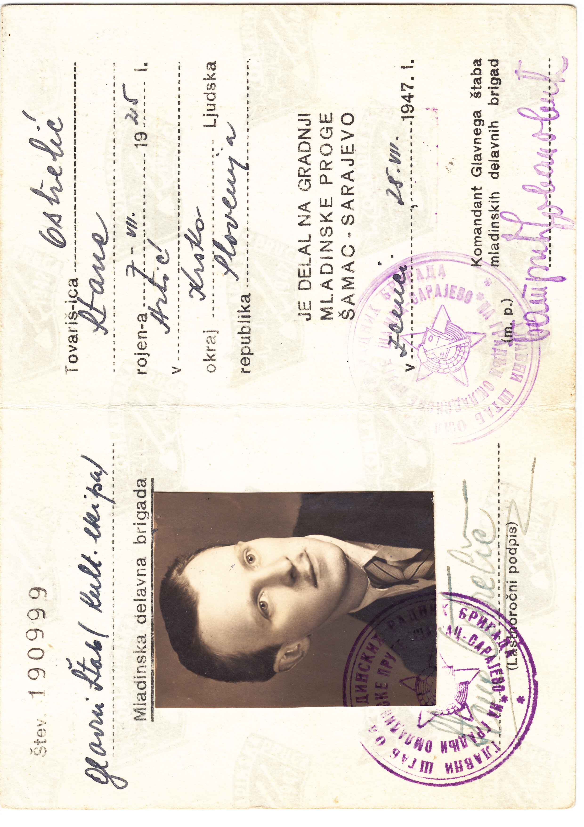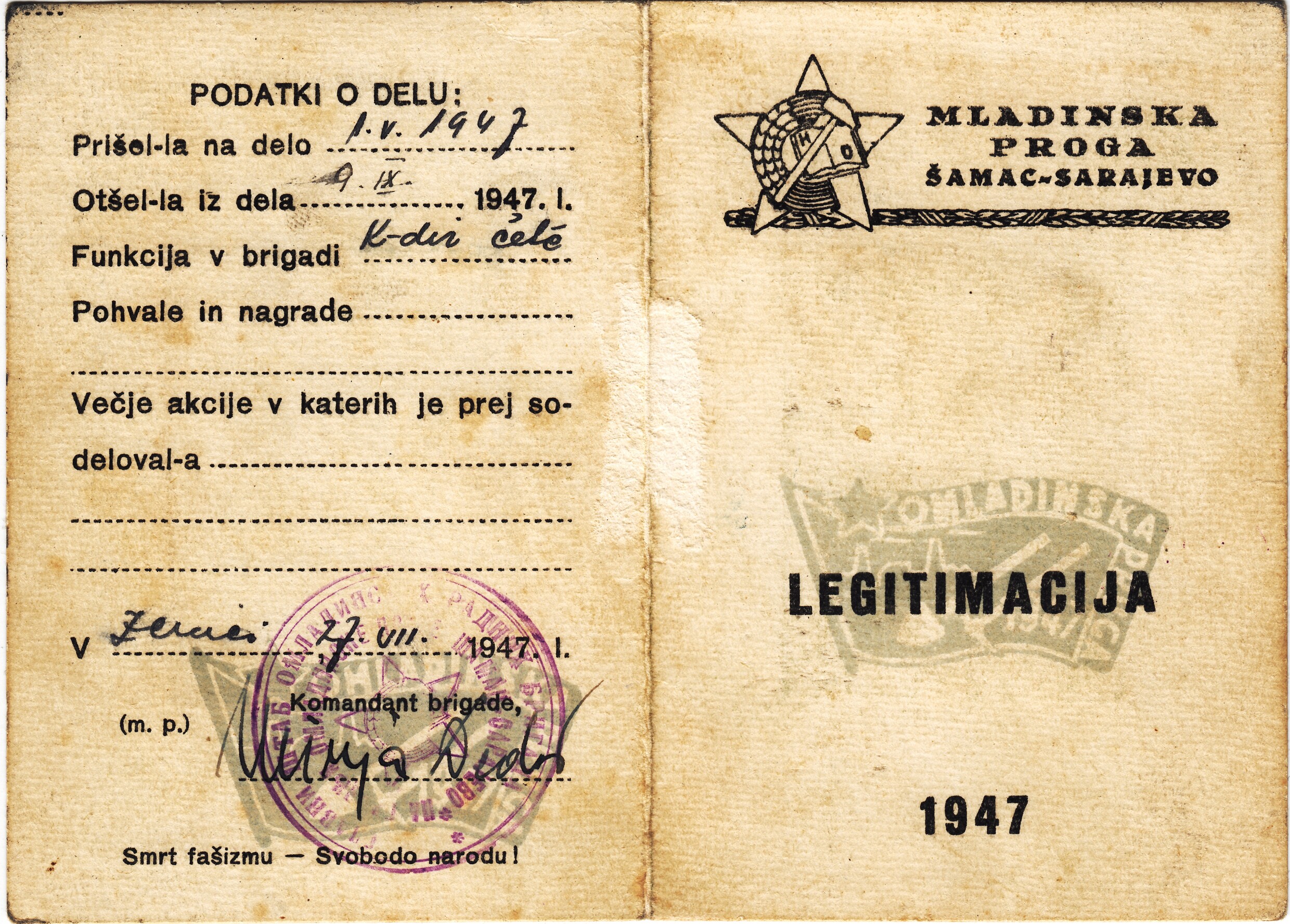 Izkaznica Staneta Ostreliča iz Artič o delu na mladinski progi Šamac–Sarajevo od 1. 5. do 9. 9. 1947. Inv. št.: Z3: 645.