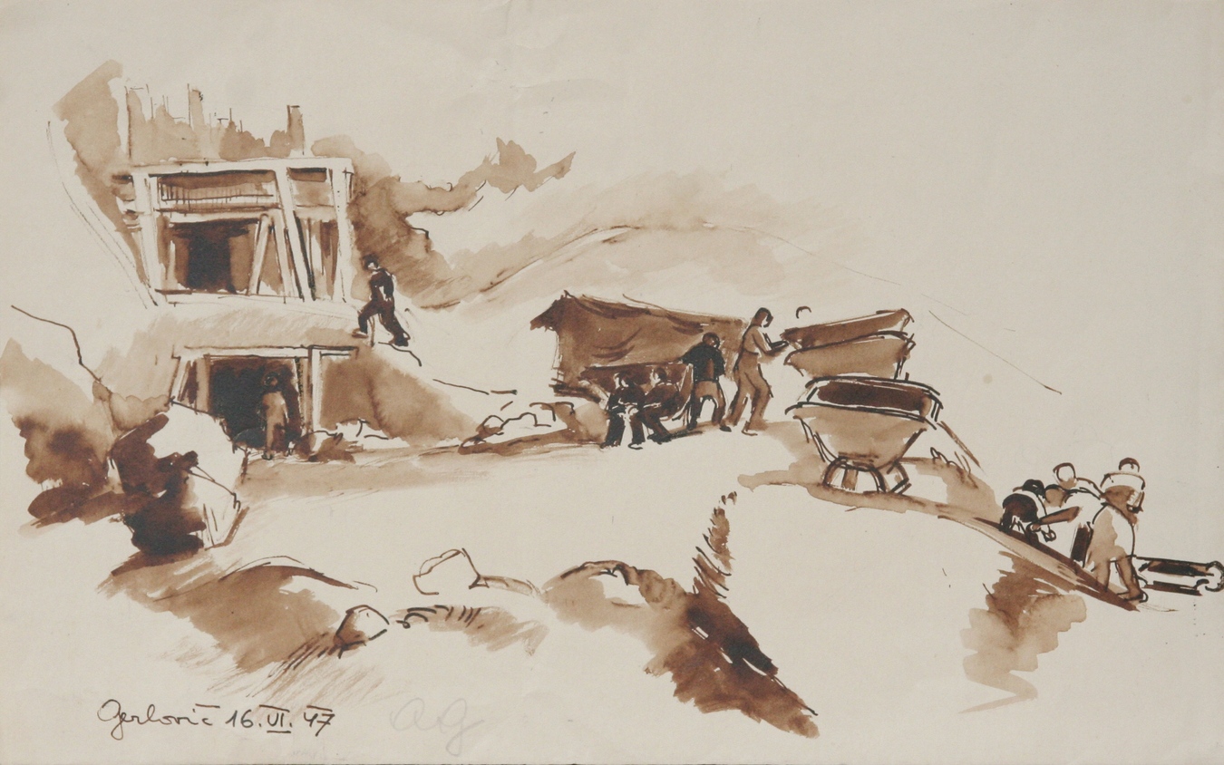 Vhod v tunel Bistričak (Ciklus Šamac-Sarajevo), 1947, Alenka Gerlovič, v: 22,1 cm, š: 35 cm, lužina na papirju. Inv. št.: KZ1-1956.