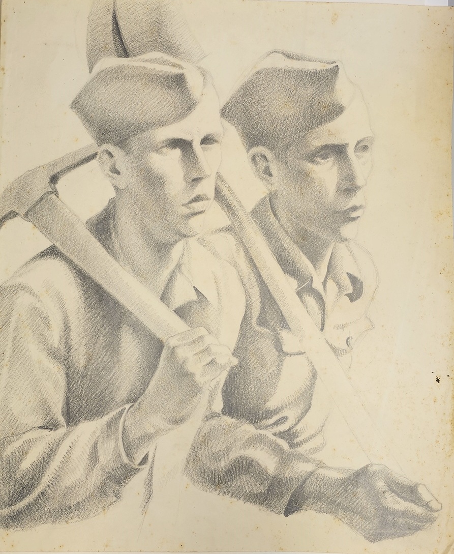 Brigadirja (Ciklus Šamac-Sarajevo), 1947, Franjo Stiplovšek, v: 59,9 cm, š: 50,2 cm, svinčnik na papirju. Inv. št.: KZ1-499.