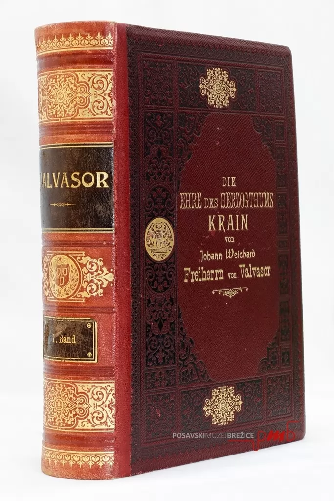 1. Slava vojvodine Kranjske, Janez Vajkard Valvasor, III. knjiga, 1689. Pot tega prvega izvoda je zanimiva, prvotni lastniki knjige so bili verjetno kapucini iz Gorice, nato kapucinski samostan iz Krškega, ki je 15. 11. 1945 iz hvaležnosti podaril knjigo Otu Aumannu (1897-datum smrti neznan), začetniku posavskega muzealstva. Leta 1946 je iz Federalnega zbirnega centra prišla v Muzej Krško in od tu leta 1949 v Posavski muzej Brežice. Inv. št.: Z3:393. Foto: Ana Sterle